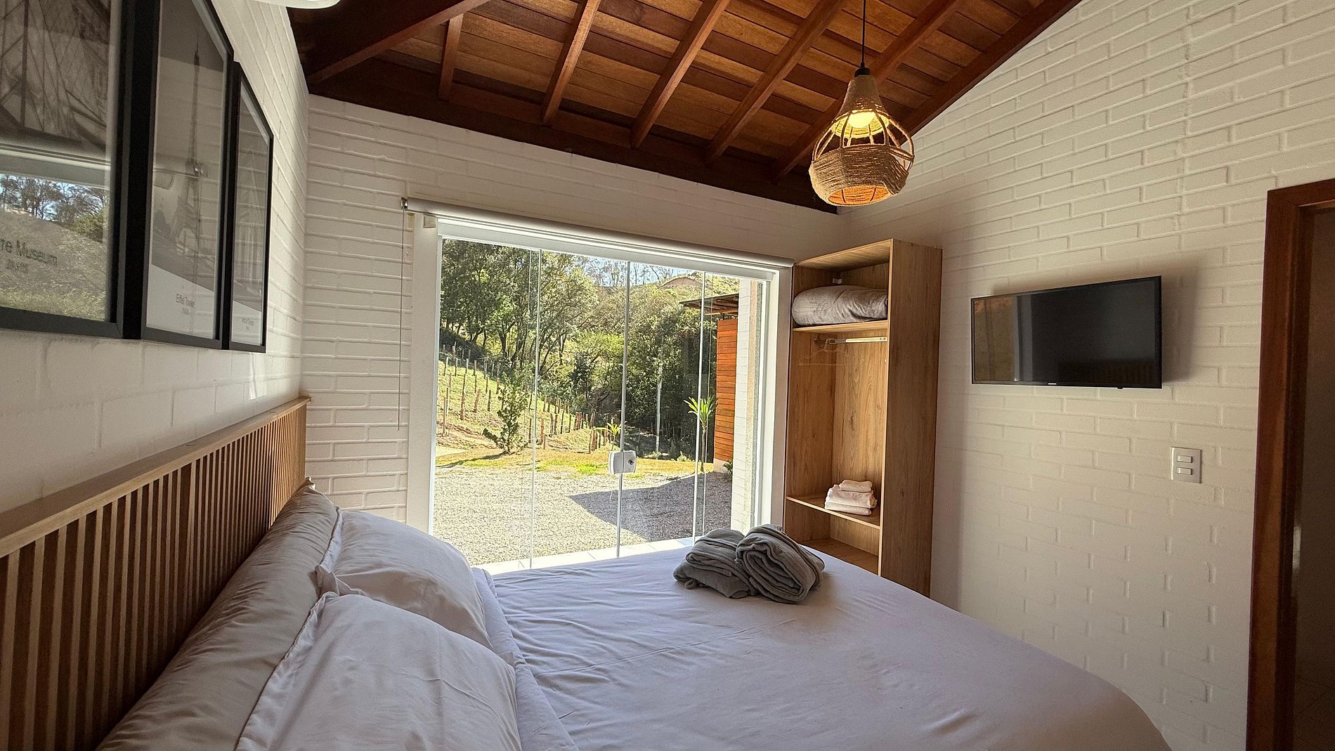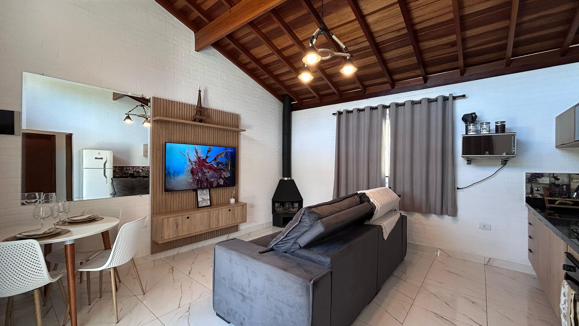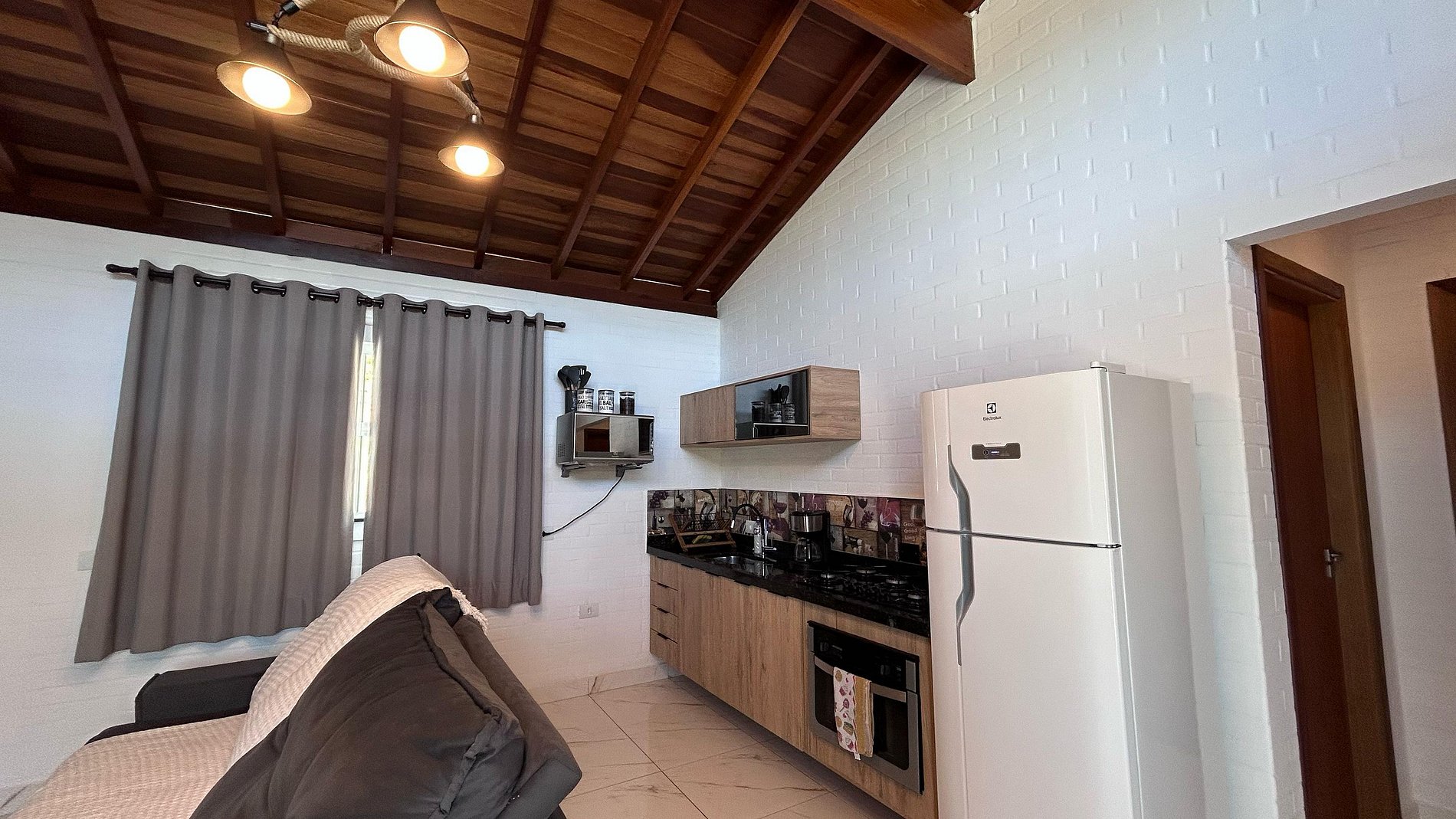 Nossos Chalés foram construídos cuidadosamente para que você possa desfrutar do sossego da natureza sem deixar o conforto de lado. Os quartos possuem ar-condicionado, Smart TV com canais de streaming, roupas de cama e banho perfeitamente limpas e confortáveis. Na cozinha você terá todos os eletrodomésticos e utensílios necessários para preparar suas refeições confortavelmente: fogão, forno elétrico e microondas, geladeira duplex, liquidificador, cafeteira elétrica, sanduicheira, air fryer, pratos, talheres e taças, além disso, na varanda, você poderá preparar o seu churrasco, fazer um lanche na chapa ou simplesmente curtir o calor do fogo nas noites frias. Toda nossa propriedade tem internet wi-fi, garantido a sua conexão com o mundo exterior.